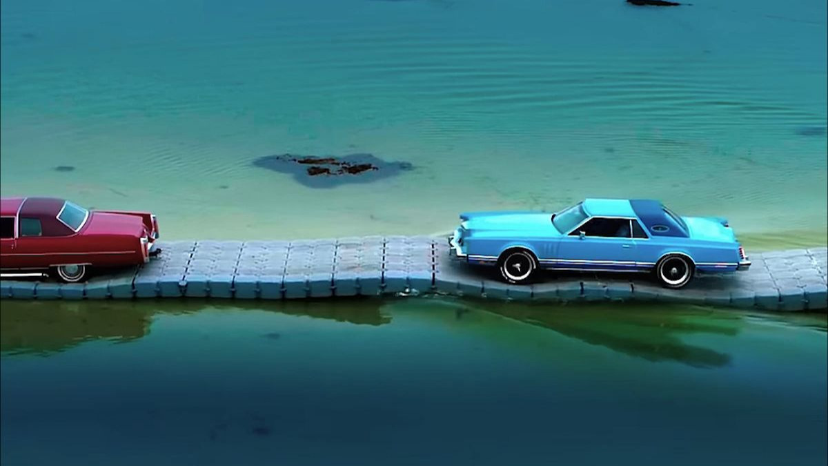 Mobil menghancurkan tumpukan korek api, dan suara ledakan berlanjut