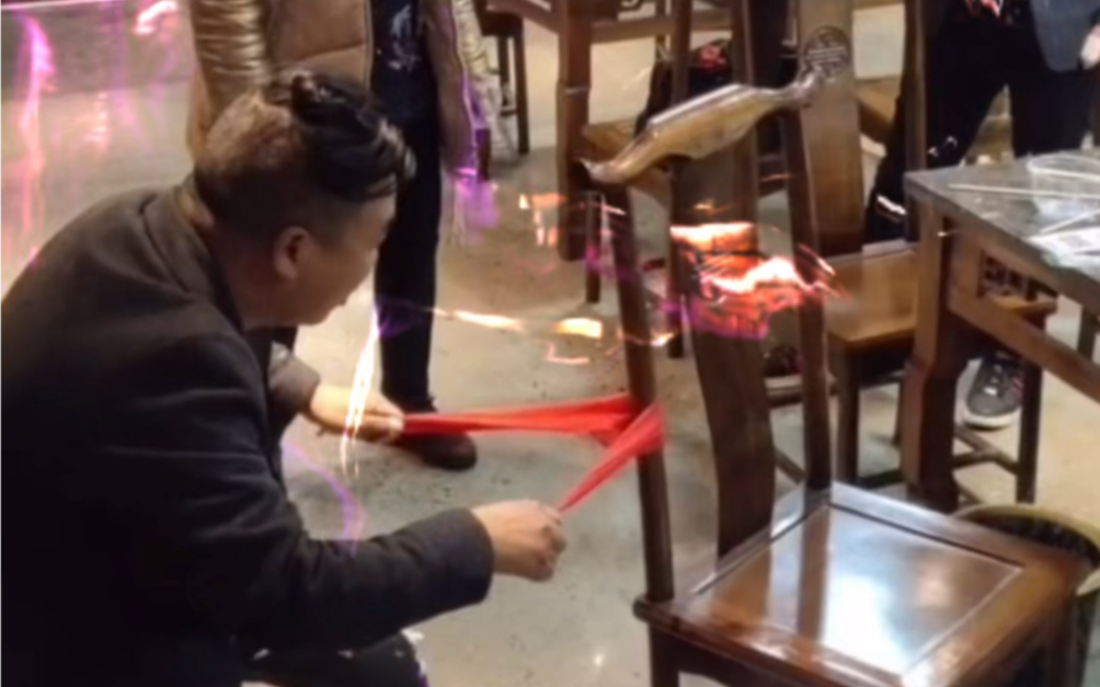 Seniman jalanan menampilkan sulap di jalan, meludahkan benang laba-laba!