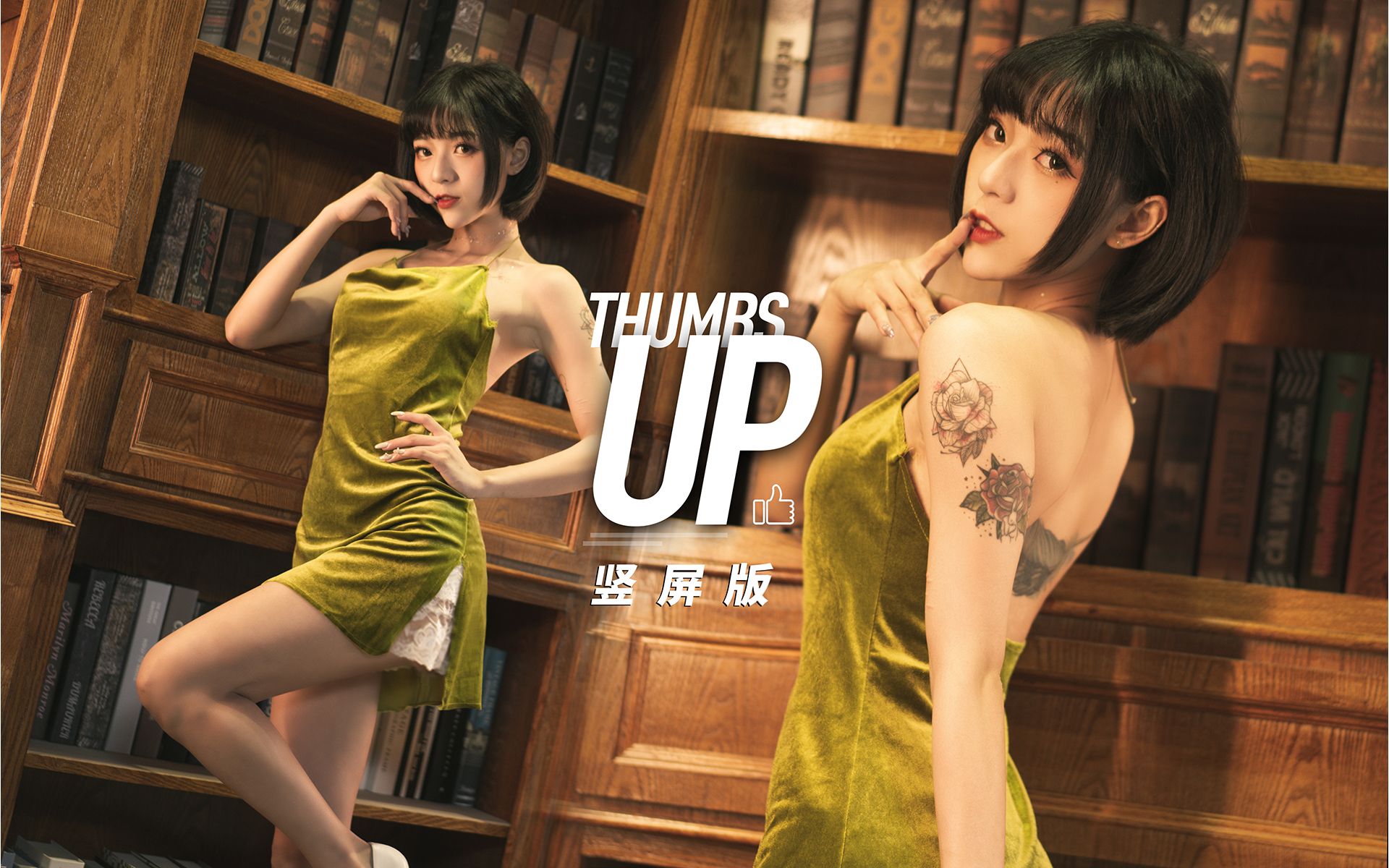 A girl dances with "thumbs up" in graceful clothes