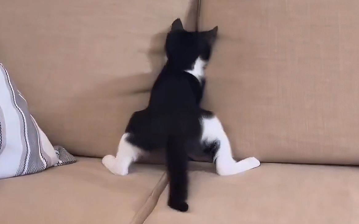The cat was confused after taking the medicine and didn't recognize its own tail