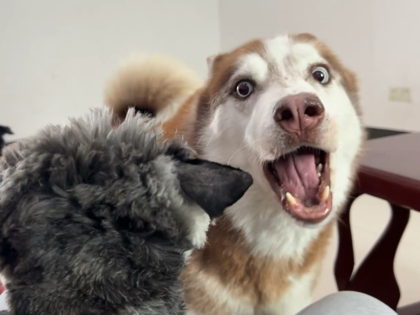 There is a pot of meat next to the "tiger". Border Collie VS Husky, who dares to eat it?