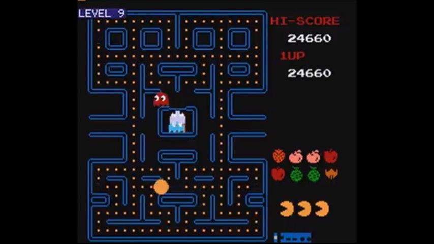 16:04 Pac-Man goes down just after the blue ghost turns back.