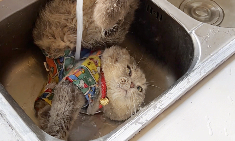 A 20-pound kitten takes a bath and transforms from a bucket of cats into a basin of cats