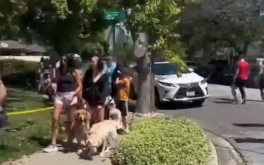 How much the puppy loves the golden retriever, look how excited the child is