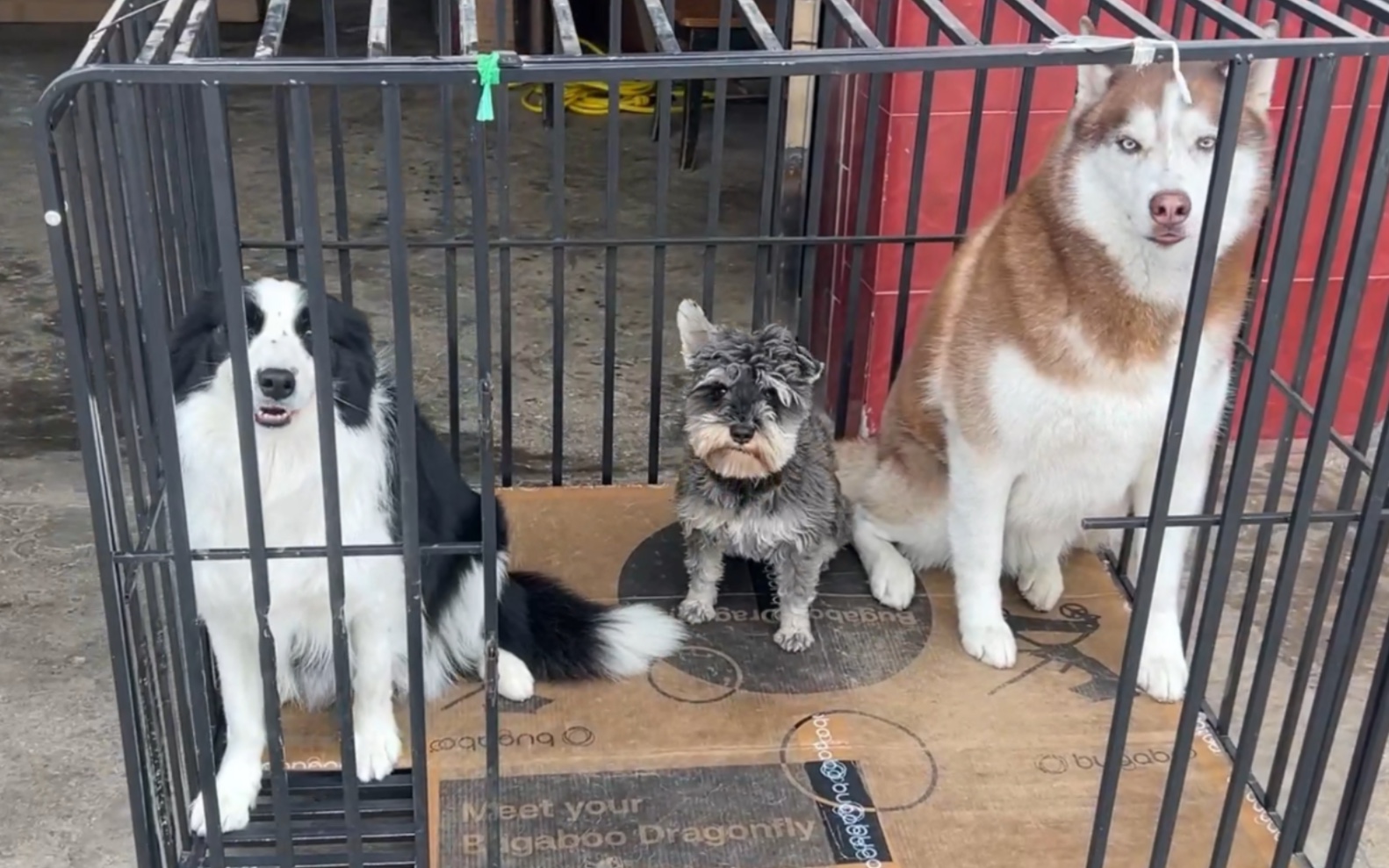 There is a pot of meat next to the "tiger". Border Collie VS Husky, who dares to eat it?