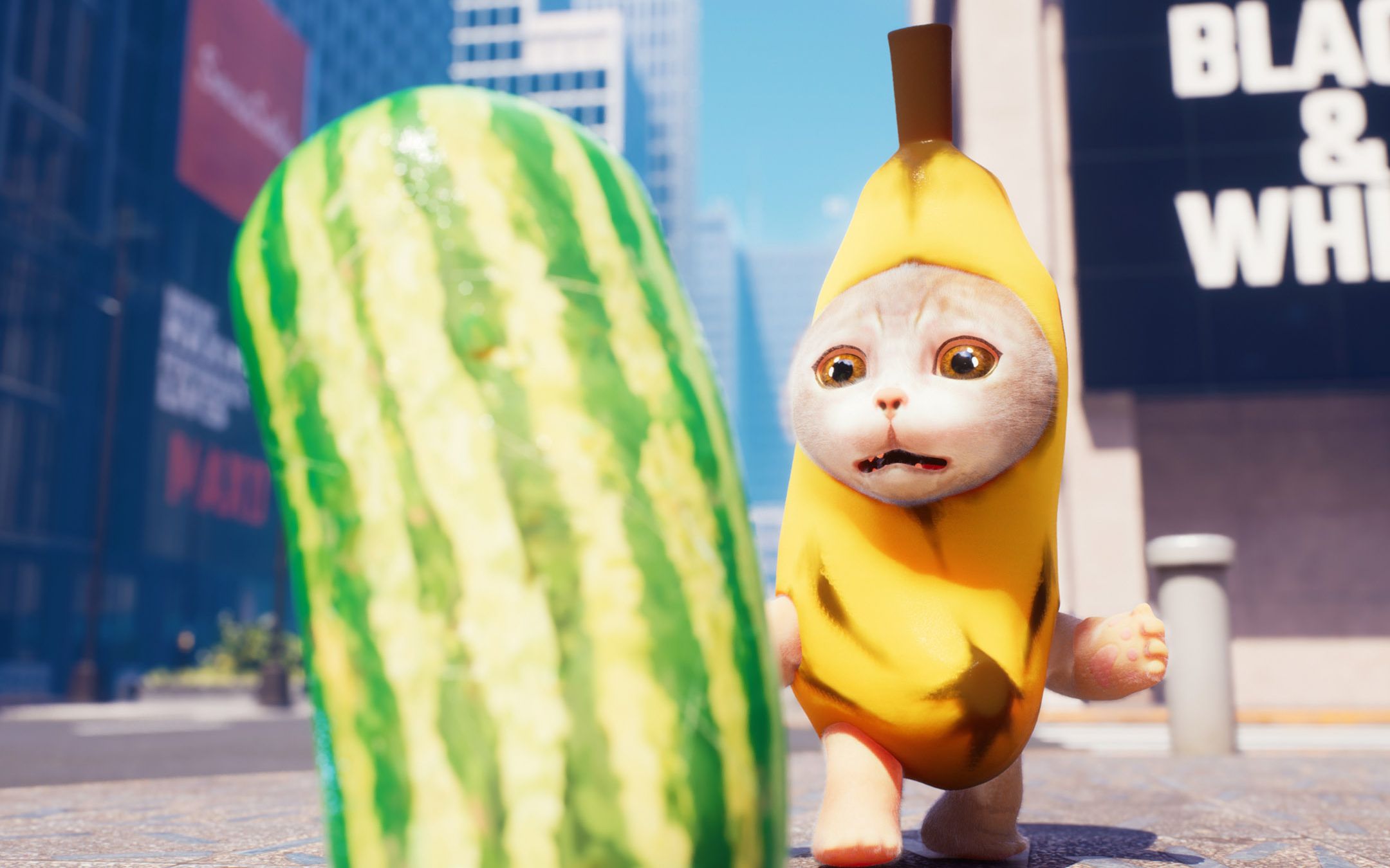 Banana Cat was selling bananas, but they were stolen by a doll.