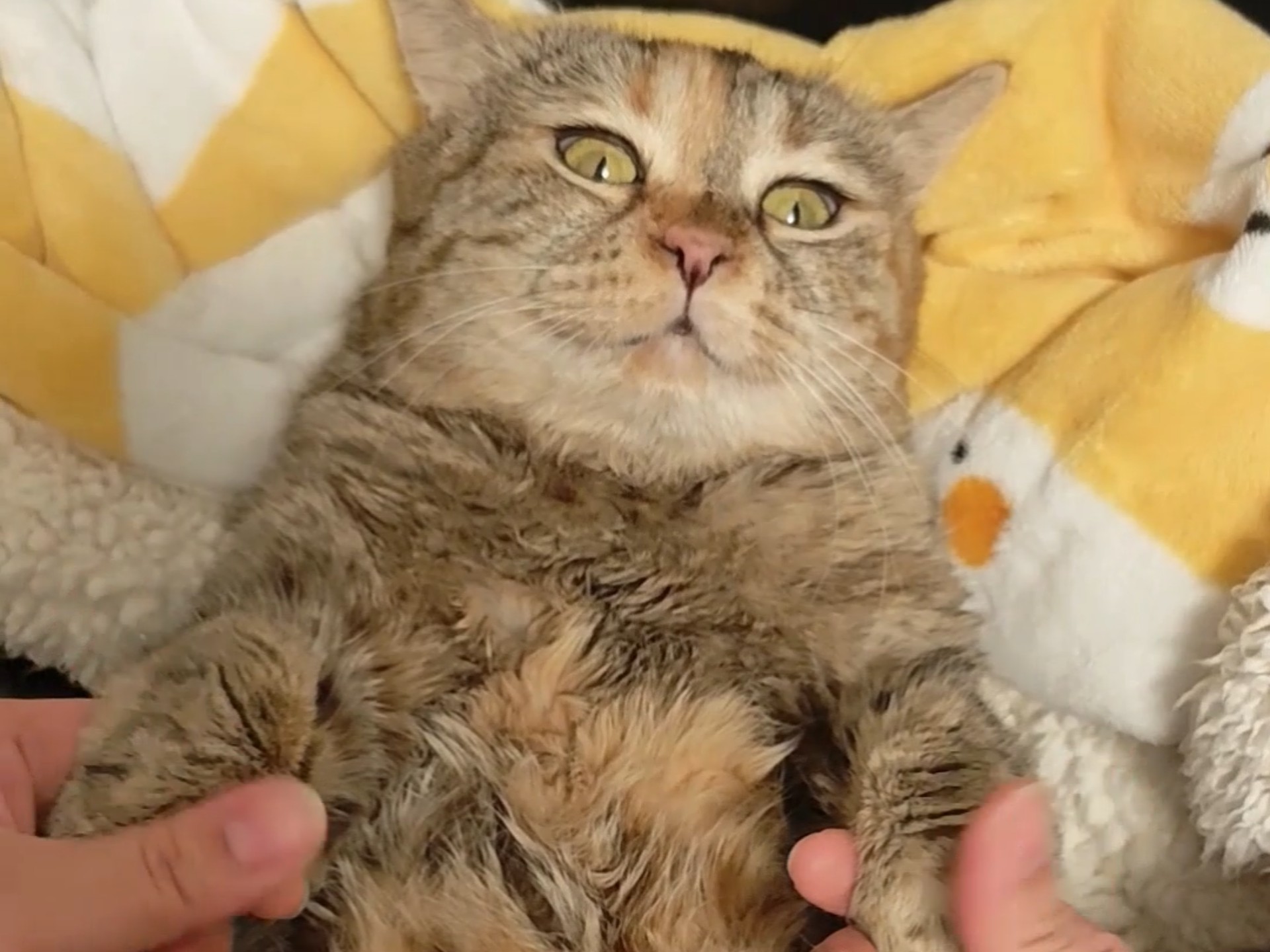"Whose cat sleeps like this?"
