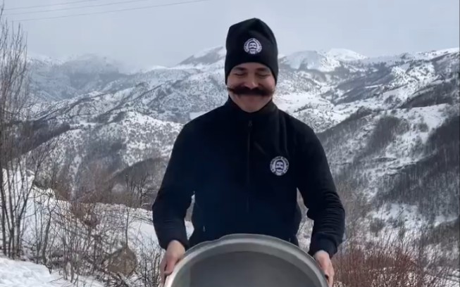 Masked guy makes various homemade delicacies outdoors with his dog.