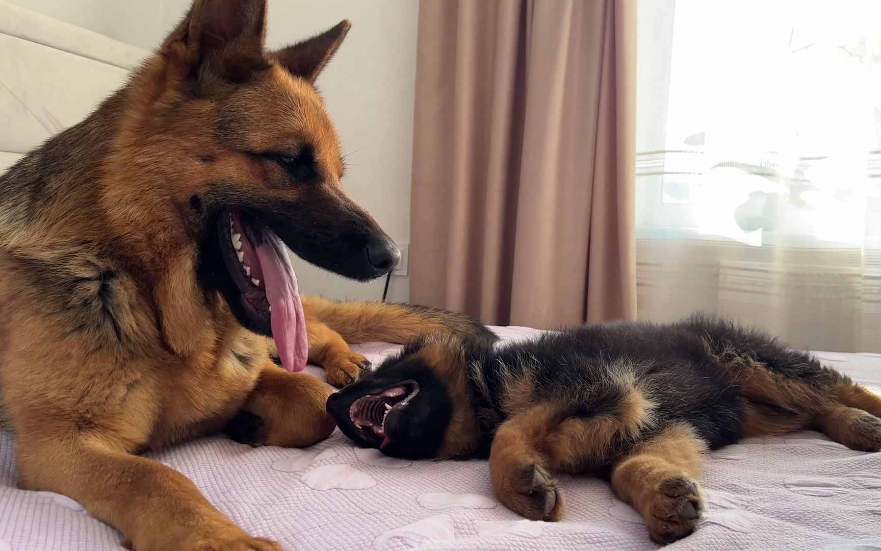 German Shepherd and Golden Retriever are helpless against the cat that has taken over their bed, the
