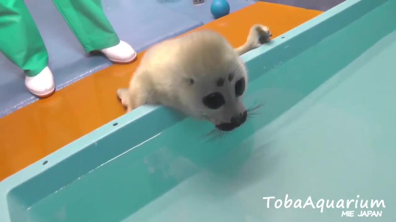 A newborn seal's first bath (?) (Toba Aquarium) (no sound)