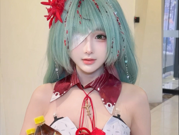 Huai Kongkong cosplay as a female police officer—tight-fitting bodysuit, leather outfit, sexy and se