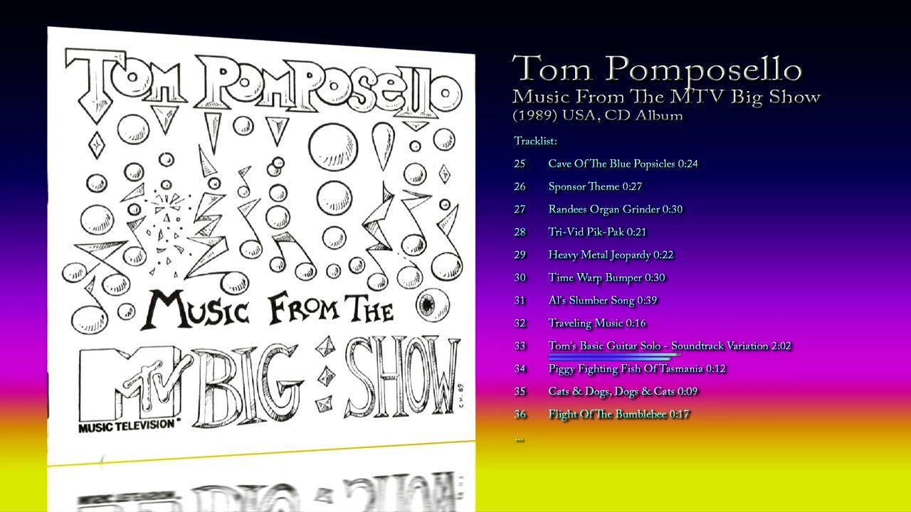 Tom Pomposello - Music From The MTV Big Show Release: 1989 USA Label: MTV Networks Format: CD, Album 2000 CDr Reissue, Unofficial Release Genre: Rock, Pop, Novelty 01 Main Theme / Big Show Open 0:35 02 Serious Video Cafe 0:21 03 Assembly Line 0:16 04 Wishful 2:20 05 Presentation Demo No.1 ("Cartoon") 1:36 06 Vince's Theme 0:29 07 Save The Snow Parrot 1:12 08 Multi-Cultural Minute No.1 0:07 09 Cuppy The Magic Stick 0:18 10 Video Dominatrix 0:32 11 Mad Lab 0:15 12 Homeboy Bumper 0:22 13 The Yahoo Serious Historic Video Fanfare 0:22 14 Win, Win, Win (Girl Group) 0:27 15 Win, Win, Win (Piano Bar) 0:27 16 Gunsmoke 0:35 17 Cattle Tap Dance Song 0:23 18 Big Karma Bumper 0:14 19 The Big Button, Quick Tally, Guns & Duckies Phone Call 1:14 20 Ted's Violin Appassinoata 1:21 21 "Weird" Al's Learning Music 0:25 22 Ask Mr. Al 0:23 23 Presentation Demo No.2 ("Metal Hip Hop") 1:45 24 Hampster Derby Victory Music 0:46 25 Cave Of The Blue Popsicles 0:24 26 Sponsor Theme 0:27 27 Randees Organ Grinder 0:30 28 Tri-Vid Pik-Pak 0:21 29 Heavy Metal Jeopardy 0:22 30 Time Warp Bumper 0:30 31 Al's Slumber Song 0:39 32 Traveling Music 0:16 33 Tom's Basic Guitar Solo - Soundtrack Variation 2:02 34 Piggy Fighting Fish Of Tasmania 0:12 35 Cats & Dogs, Dogs & Cats 0:09 36 Flight Of The Bumblebee 0:17 37 Breakdown Bumper 0:22 38 "Weird" Al At The Voodoo Shrine 0:29 39 Storybook Time 1:17 40 Multi-Cultural Minute No.2 0:09 41 Cafe A La Conga 0:15 42 Presentation Demo No.3 (Sexy Hiccups) 1:45 43 Pomp & Circus Stance 0:35 44 The Bumpy Road Of Life 1:09 45 Hobo Camp Bumpy Road 0:51 46 Closing Theme / End Credits 2:05 Enjoy Your Listening ;) ╔═╦╗╔╦╗╔═╦═╦╦╦╦╗╔═╗ ║╚╣║║║╚╣╚╣╔╣╔╣║╚╣═╣ ╠╗║╚╝║║╠╗║╚╣║║║║║═╣ ╚═╩══╩═╩═╩═╩╝╚╩═╩═╝ Follow MaJeSTiK MaGiC Universe: Time Machine MaGiC RKO: ▶ https://www.youtube.com/channel/UCHp2dcZh4duXHUcbMtZP_wA/?sub_confirmation=1 MaJeSTiK MaGiC'S PARADISIO (FRENCH CHANNEL): ▶ https://www.youtube.com/channel/UCZtZkGDTumzmB-28T_2wNmg/?sub_confirmation=1 Other Link MaGiC RKO