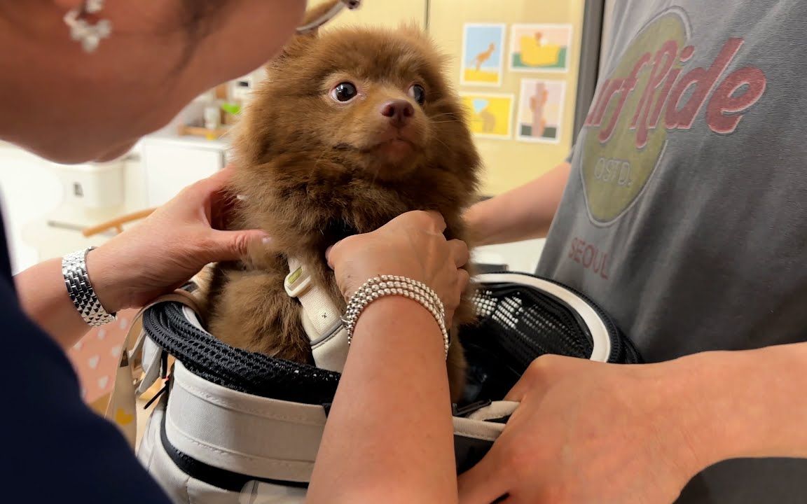 The Pomeranian dog eats sausage rice cake and pork rice cake online. It’s so delicious to chew!