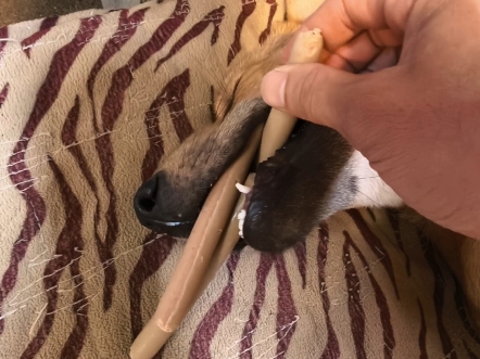 Ten pounds of water was placed next to the dog, like oral liquid, and my dad chased him and fed him