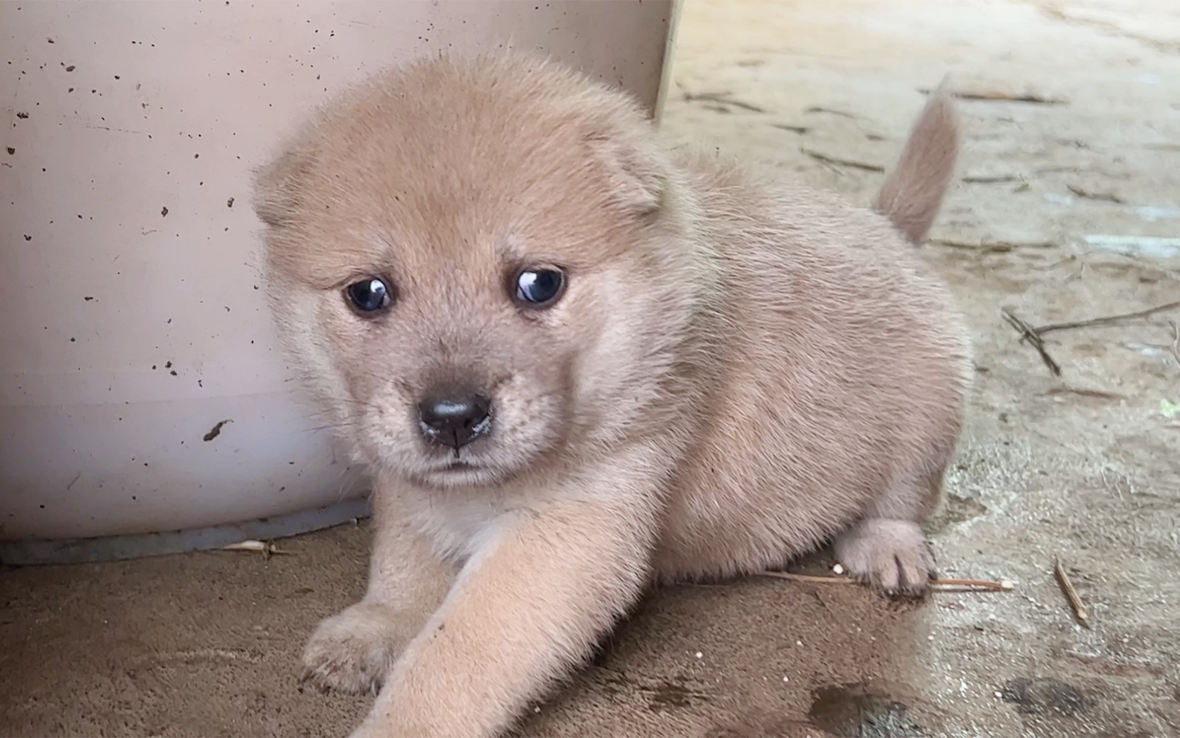 The bad-tempered little puppy came to beg for food. He looked very obscene and squatted at the door