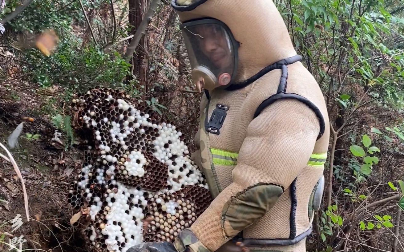 A giant hornet's nest was discovered in the ancient village. Ziwei brought his equipment to fight ag