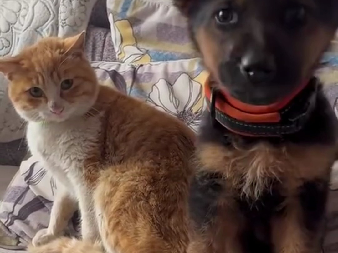 German Shepherd and Golden Retriever are helpless against the cat that has taken over their bed, the