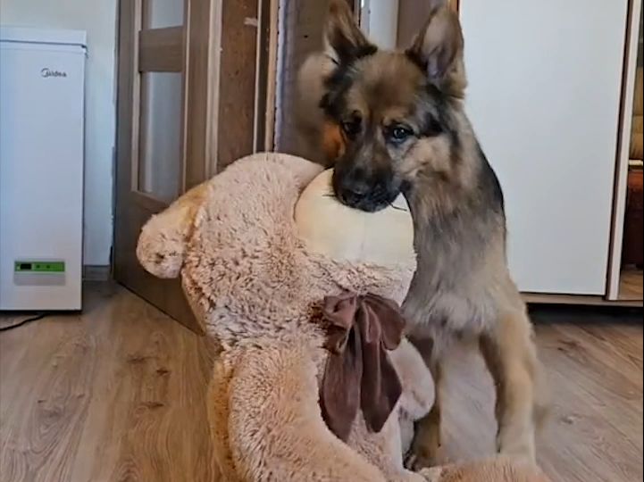 German Shepherd meets a bunny for the first time