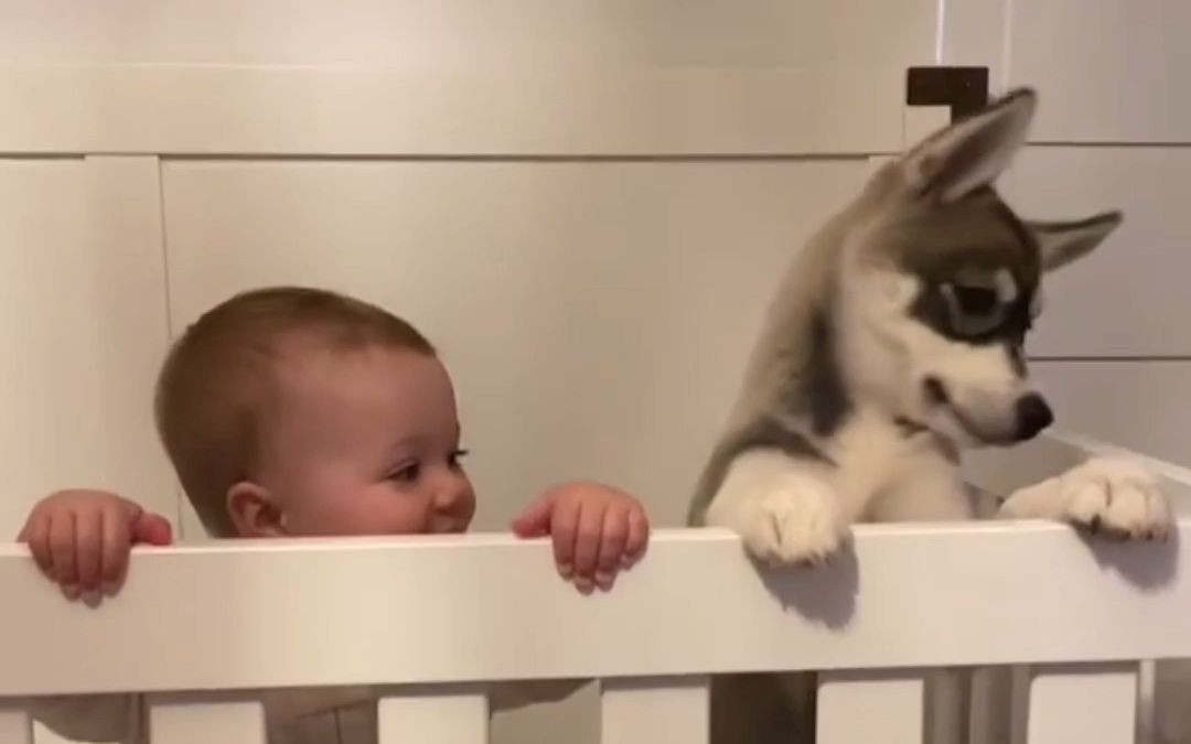 Husky cheers up crying baby. Too cute!