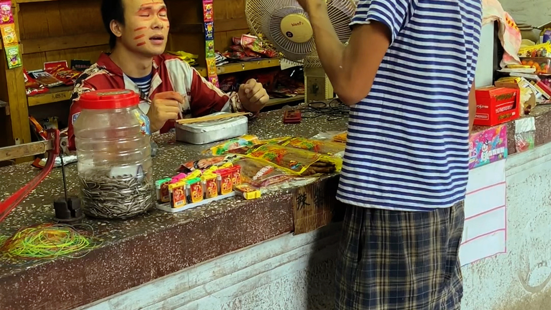 Ah Niu stole Fatty's fruit cake and was beaten badly by Fatty!