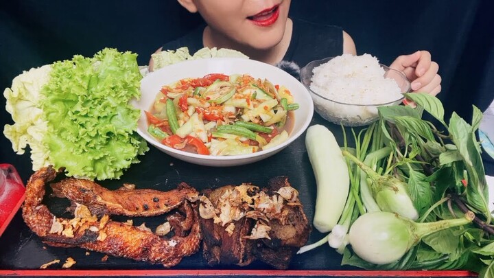 ASMR MUKBANG SPICY CUCUMBER WITH FISH SAUCE+ FRIED PORK BELLY &FRIED SALMON BELLY.
