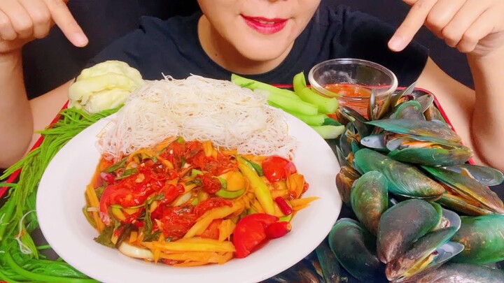 ASMR SPICY PAPAYA SALADS WITH SEAFOOD SQUID,SHRIMP & COCKLES WITH FISH SAUCE