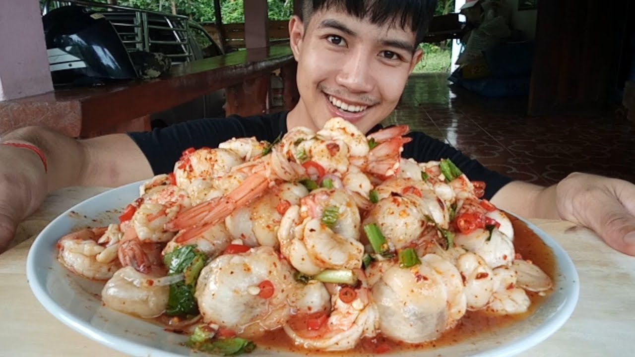 ตำถาดกุ้งสด!!! กุ้งตัวใหญ่ๆ เนื้อกรอบๆ ตำแบบเผ็ดแซ่บนํ้าแดงเดือด