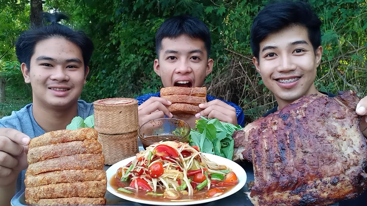 ส้มตำกุ้งสะดุ้งหมูอบนํ้าผึ้ง ข้าวเหนียวดำจํ้านํ้าส้มตำ แซ่บมากมื้อนี้