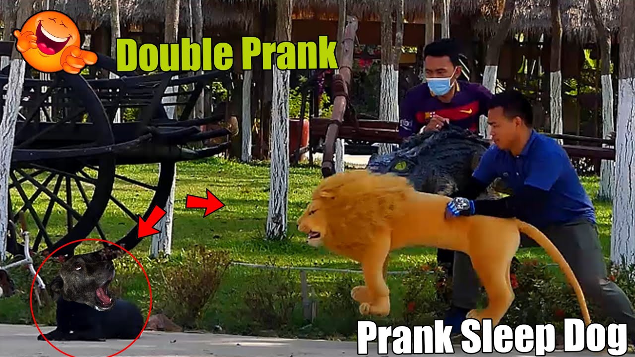 Double Big Fake Lion & Crocodile Prank Real Dog Sleeping Very Funny Reaction - Try To Stop Laugh