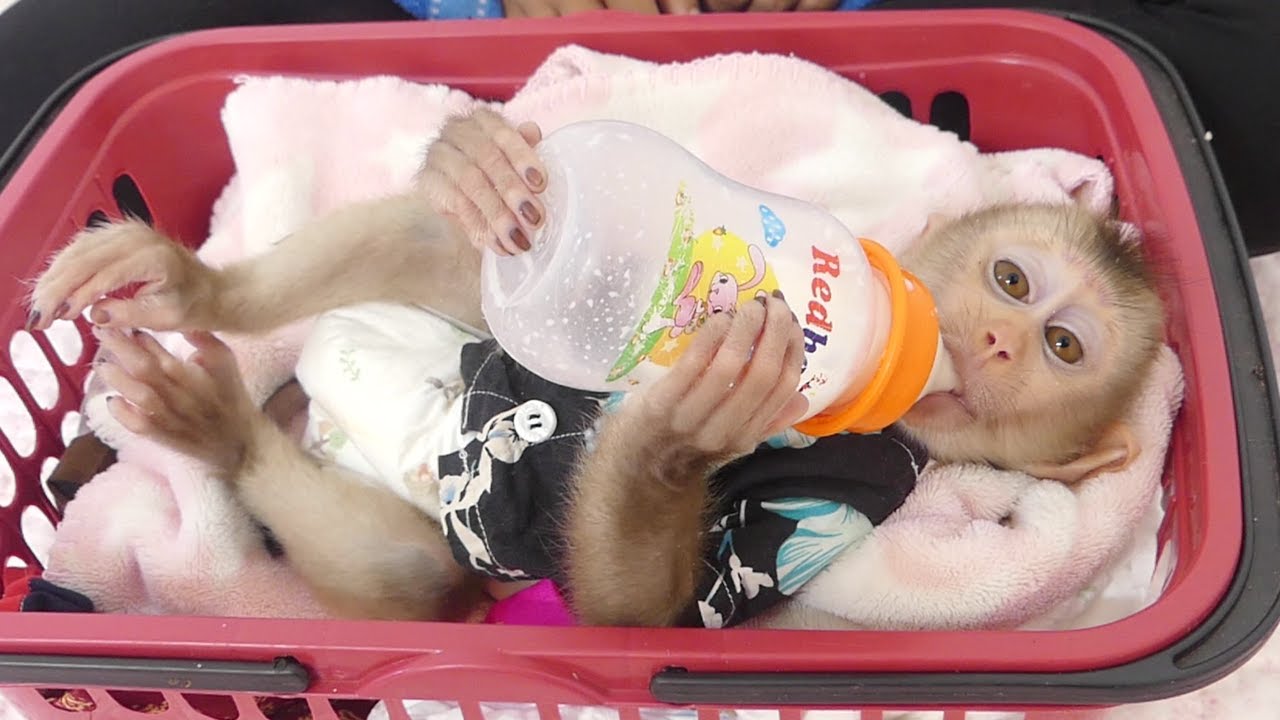 Bravo!! Orphan Baby monkey drinking milk with milk bottle