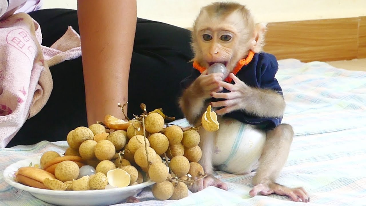 Very Smart baby monkey! little boy Maki Feeling Happy when open Basket see Lots of fruit On a plate