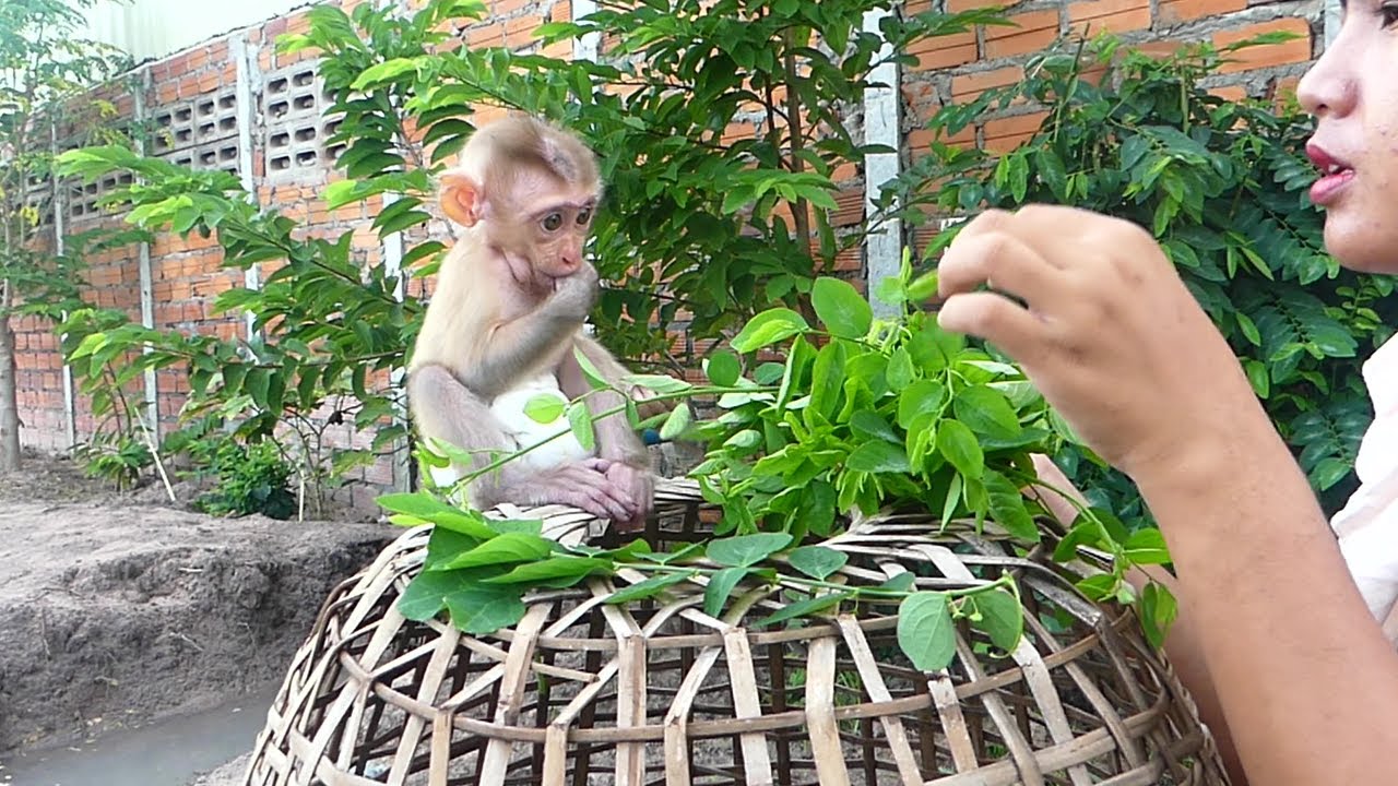 Very Smart baby monkey! little boy Maki Feeling Happy when open Basket see Lots of fruit On a plate