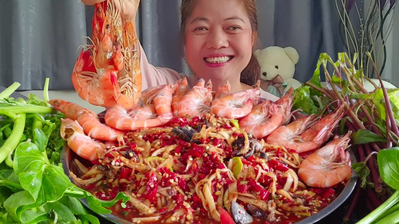 ตำถาดกุ้งสด!!! กุ้งตัวใหญ่ๆ เนื้อกรอบๆ ตำแบบเผ็ดแซ่บนํ้าแดงเดือด
