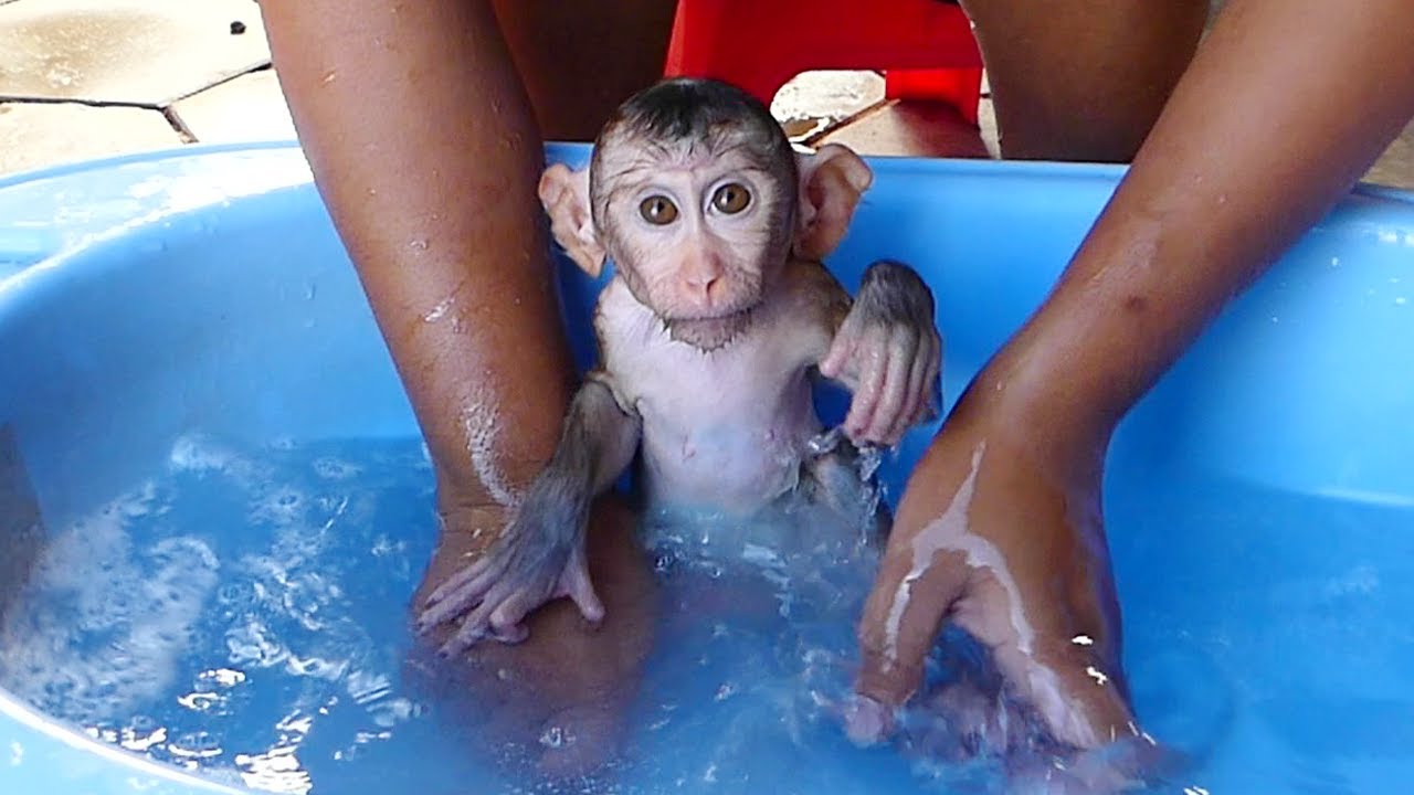 Amazing!! The first time that Little Baby Maki swimming | Monkey Happy Swimming