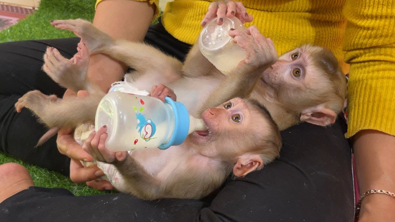 The Most Lovely Three Monkeys Lion, Liheang And Sono Sleep Drinking Milk Very Soft Eyes