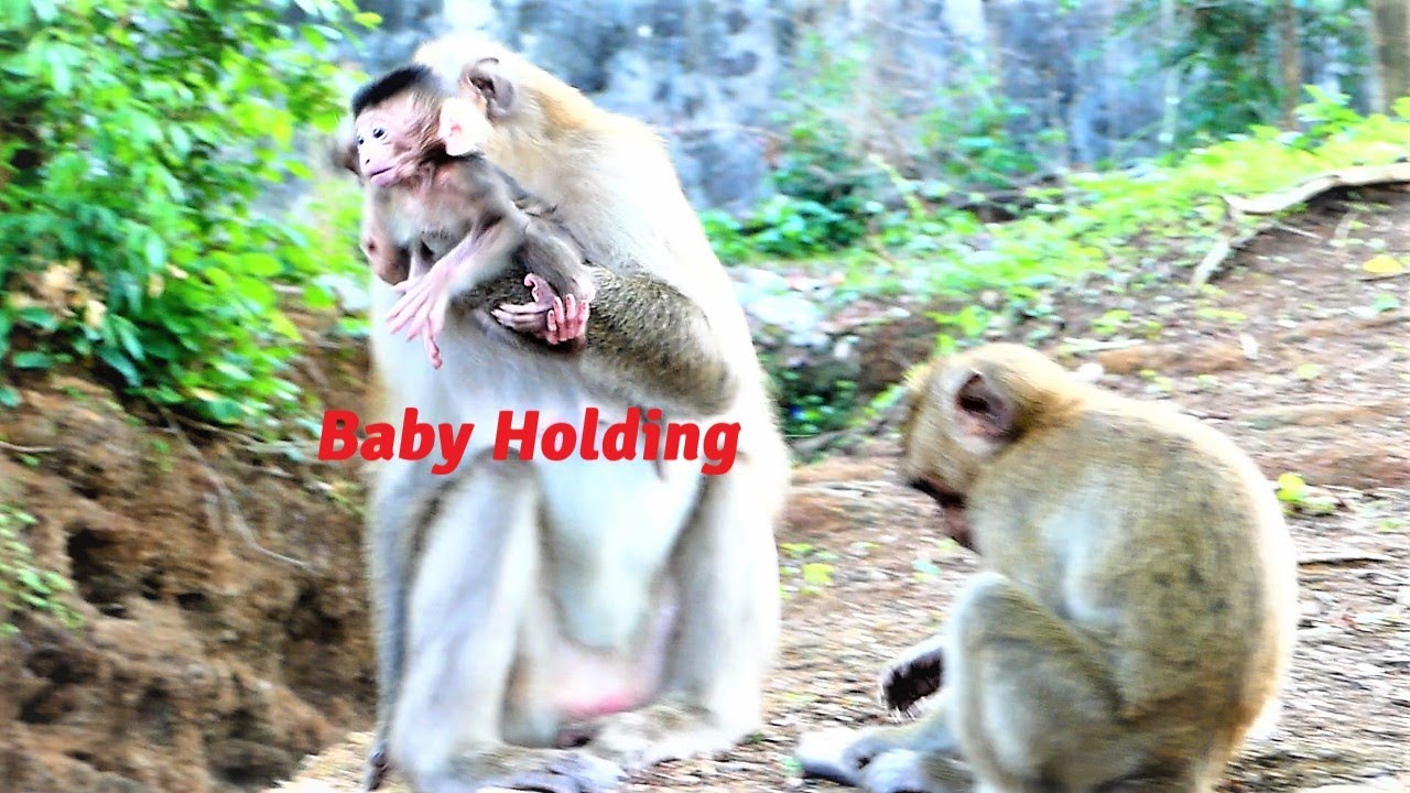 Poor Mother Monkey and Cutest Newborn Baby Walking on The Sloped Place