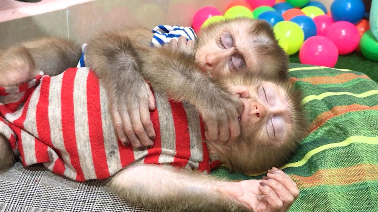 Soundly asleep!! Baby monkey Maki and Maku fall in deep dream after mom comfort before go to work