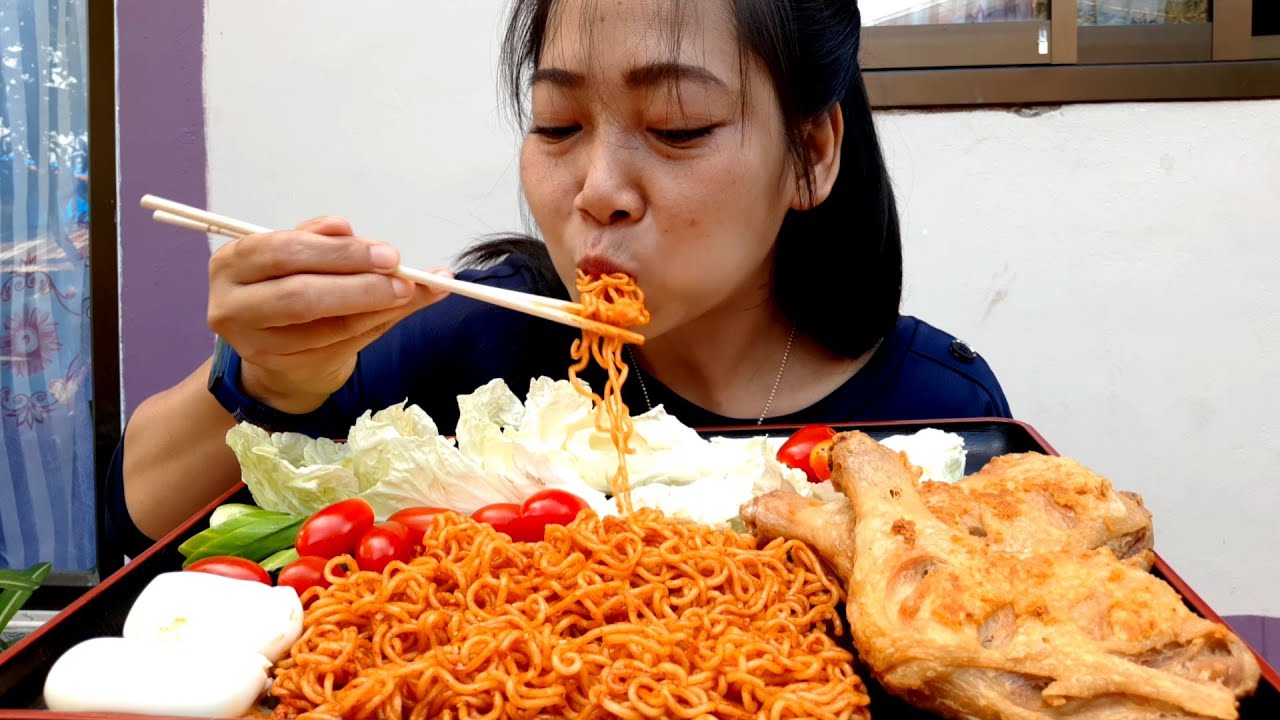 มาจร้าหมูย่างในกระทะ เห็ดเข็มทองผัด มาม่าเผ็ด กับผักสดกรอบๆเลยค่ะ