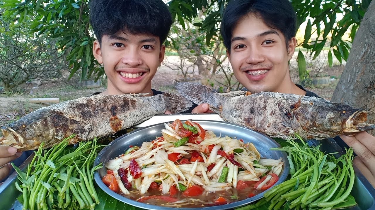 ส้มตำปลานิลอบโอ่ง พร้อมผักและหมี่ขาวเจียวนํ้ามัน และผักสดนํ้าจิ้มเด็ดๆ.