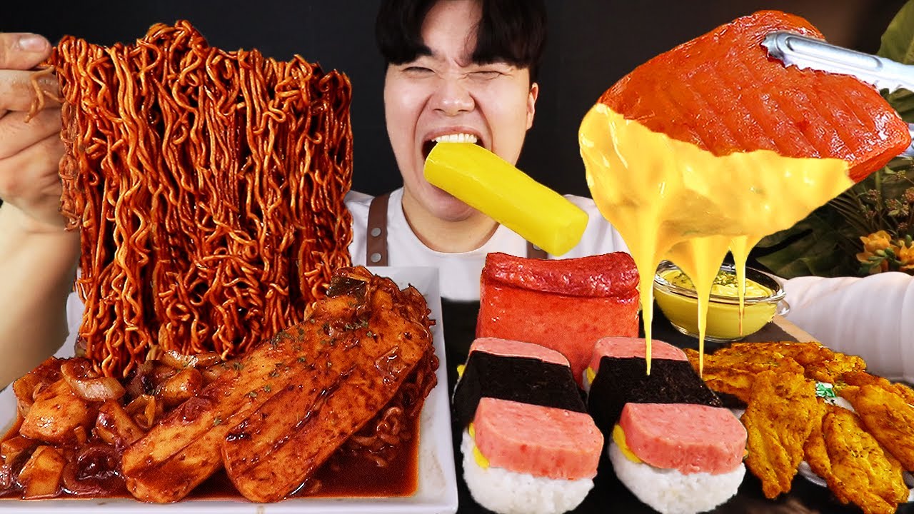 ASMR MUKBANG 짜파게티 & 치즈 통스팸 & 양념 치킨먹방! BLACK BEAN NOODLES & CHEESE SPAM & FRIED CHICKEN EATING SOUND!