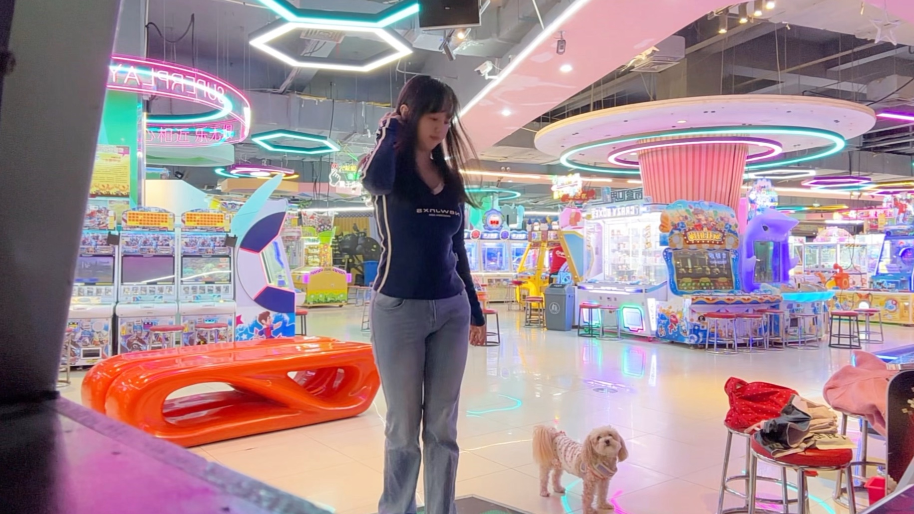 รองเท้าบูทสูงเหนือเข่า เด็กผู้หญิงเต้นด้วยรูปร่างที่สวยงามในอาร์เคด มันลื่นนิดหน่อย ดังนั้นเธอจึงทำไ