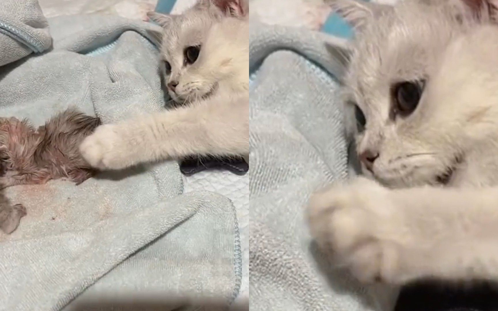 [Pecinta Kucing] Anak kucing belajar membunyikan bel dari kelinci