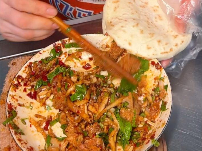 เส้นก๋วยเตี๋ยวไส้หมูในตลาดผักของเมืองเฉิงตูมีปมที่พิเศษ และเต็มไปด้วยน้ำในคำเดียว