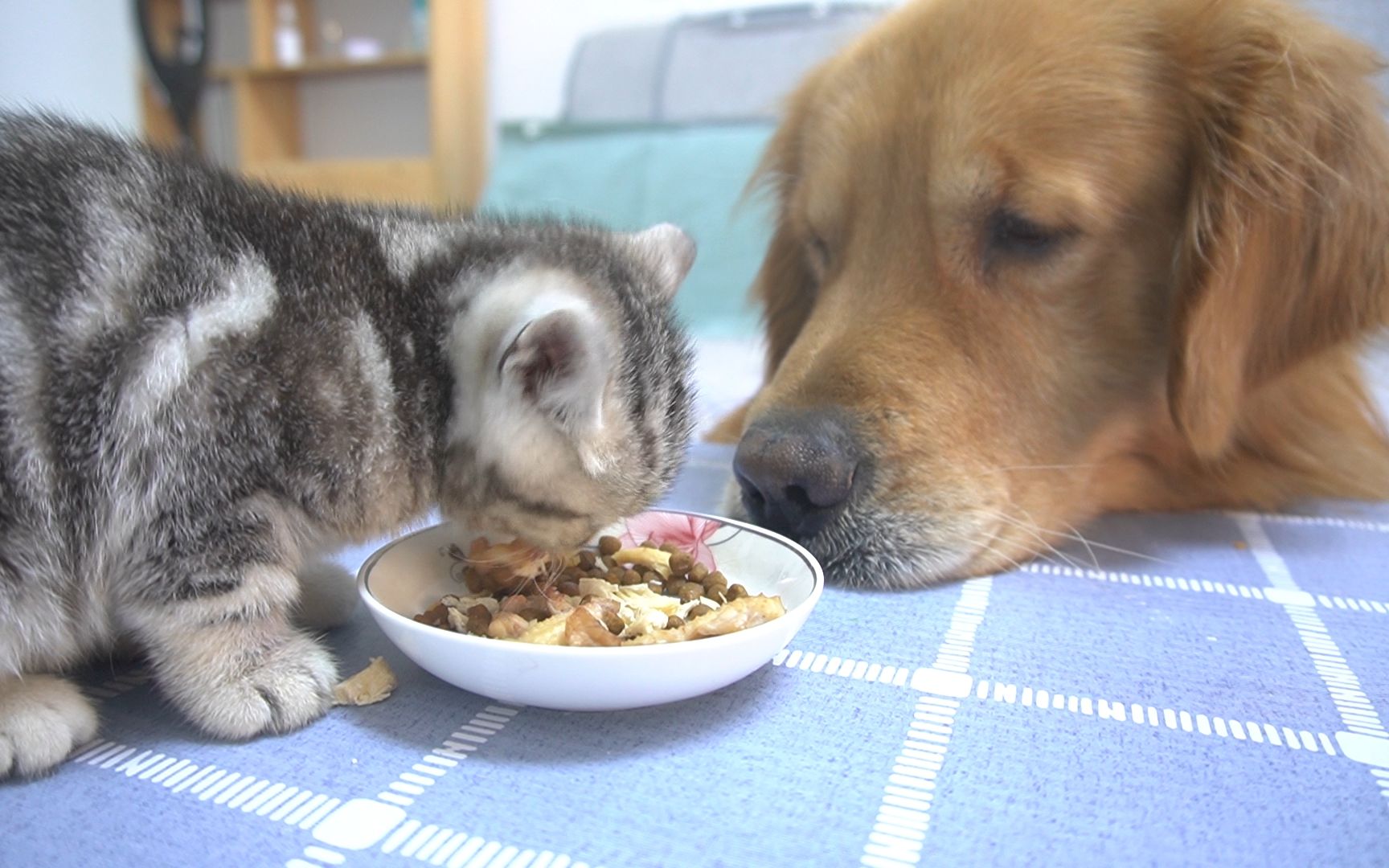 ลูกแมวปีนขึ้นหลังเจ้าหมาเพื่อขออาหาร