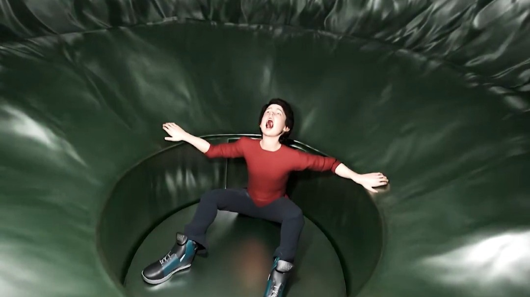 ชายคนหนึ่งนั่งบนหัวฉีดลม จนถูกเติมลมเข้าไปจนเต็ม