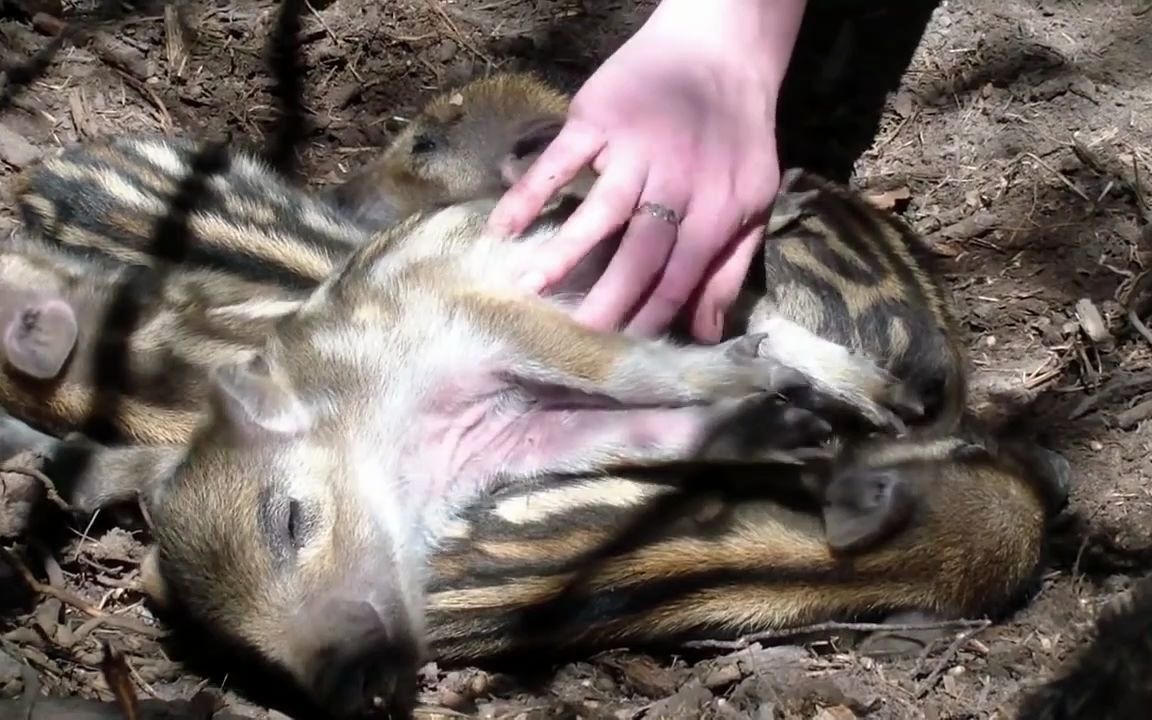 พี่น้องฮวาหนง: พอปล่อยหมูหอมออกมาแล้วมันดูเชื่องขึ้น แค่ลูบท้องมันก็ล้มตัวลงนอนเลย ว่านอนก็นอน ว่าลุ