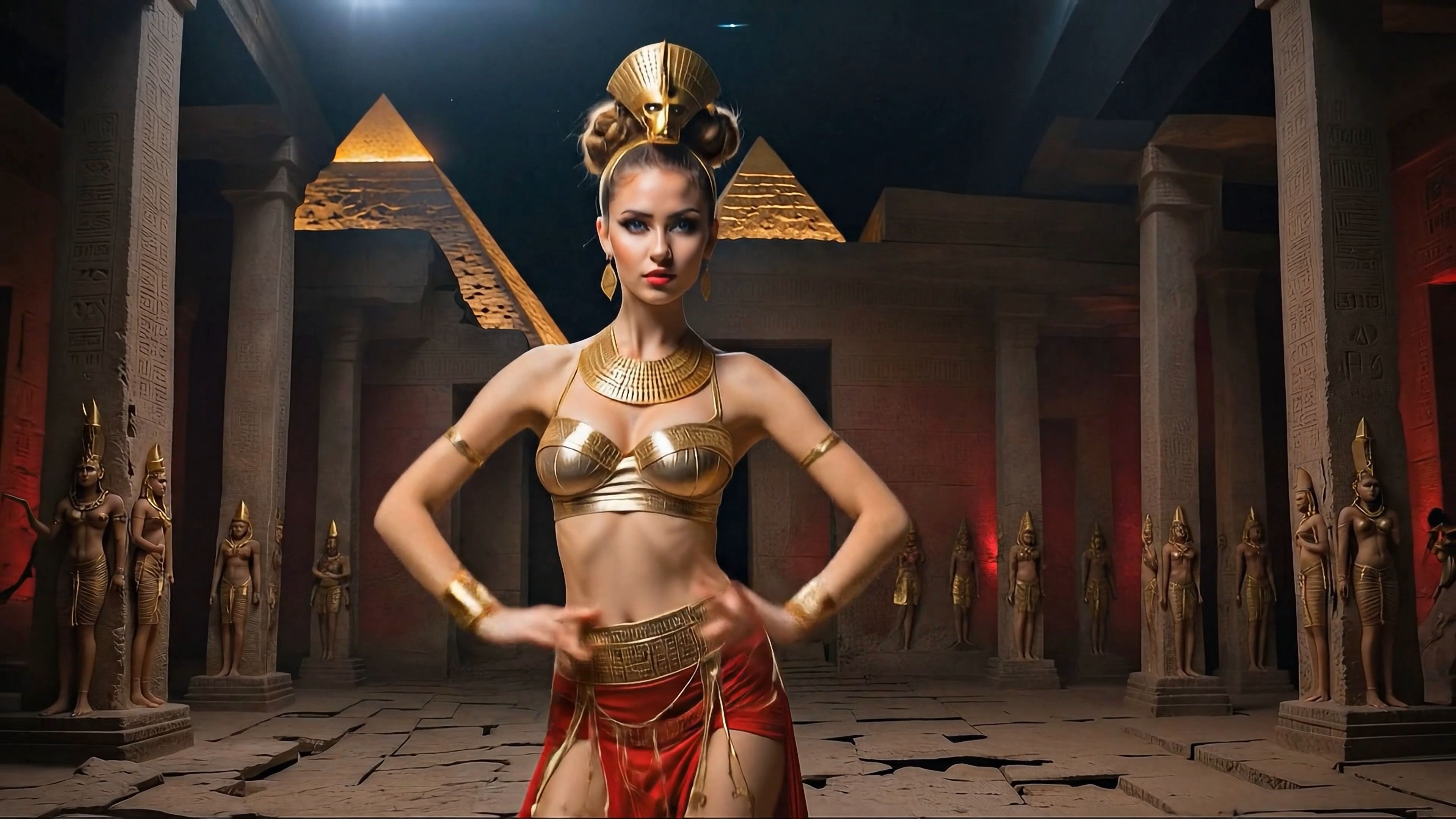 In the distant sands of time, where the Nile whispered secrets to the pharaohs, lived a beautiful dancer named Neferet. Her movements were like the gentle waves of the river—full of grace, mysterious, and hypnotic. The Great Pyramid was a powerful spacecraft, capable of interplanetary travel, powered by the energy of the stars and ancient magic. One night, under the silver glow of the moon, Neferet entered the interior of the Great Pyramid and performed an ancient dance in honor of the goddess Isis. In the whirl of her arms and hips, adorned with golden bracelets and a linen robe, she activated its hidden power. The Pyramid trembled, detached from the earth, and soared into the cosmos like a gigantic interplanetary ship. Suddenly, she found herself on an alien planet—Venus, shrouded in dense, golden clouds, where the air pulsed with heat and mystery. In the heart of this cosmic void stood an enormous hall in the shape of a pyramid, built from shimmering, otherworldly stone, with walls covered in hieroglyphs pulsing with pale light—an echo of ancient journeys between worlds. Undaunted, Neferet stepped into the center of the hall. Beneath the high vaulted ceiling, she began to dance. Her body moved to the rhythm of an invisible melody—her arms rose toward the sky like the flight of birds, her hips swayed in a hypnotic circle, her feet traced patterns on the floor, awakening echoes of ancient gods. Her golden ornaments gleamed in the rays of the Venusian sun filtering through the crevices, and her dance filled the hall with magic, connecting Earth's past with the cosmic present. In this dance, Neferet became the goddess of two worlds—a traveler from the pharaohs on the planet of love and mystery, where pyramids connected the stars.
