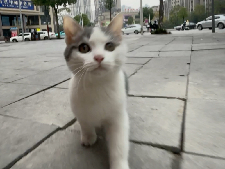 แมวขาวตัวน้อยสง่างามที่ดูเหมือนจะหลงทางกำลังดมกลิ่นคุณอย่างไม่แน่นอน