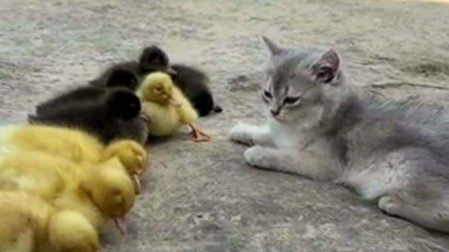 ลูกแมวได้ฝึกลูกเป็ดที่ได้รับการฝึกฝนมาเป็นอย่างดีจนสำเร็จ