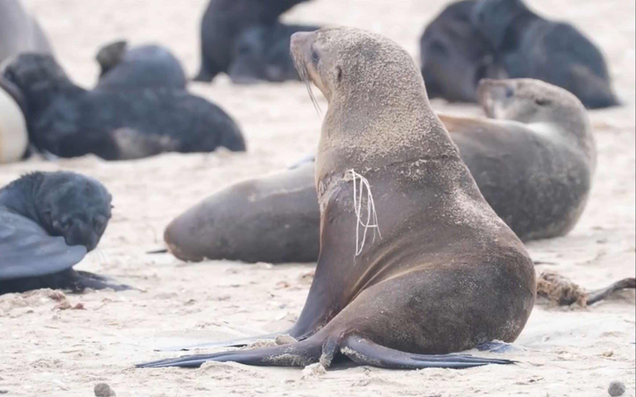 ลูกสิงโตทะเลติดอยู่ในอวนจับปลาผิดกฎหมายขนาดใหญ่และไม่สามารถเคลื่อนไหวได้ [ทีมอนุรักษ์ทางทะเลนามิเบีย